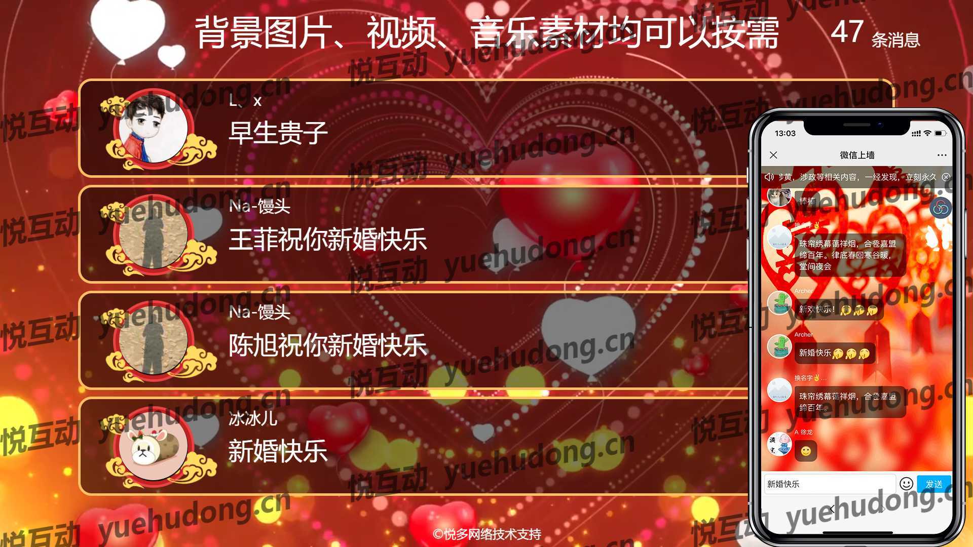 也叫做“微信墙”,用户扫码参与发送文字内容,大屏幕上可以实时滚动显示文字内容,后台也可以开启审核内容,特殊敏感的词可以后台直接自动过滤掉,在各种校园活动中应用最为广泛。