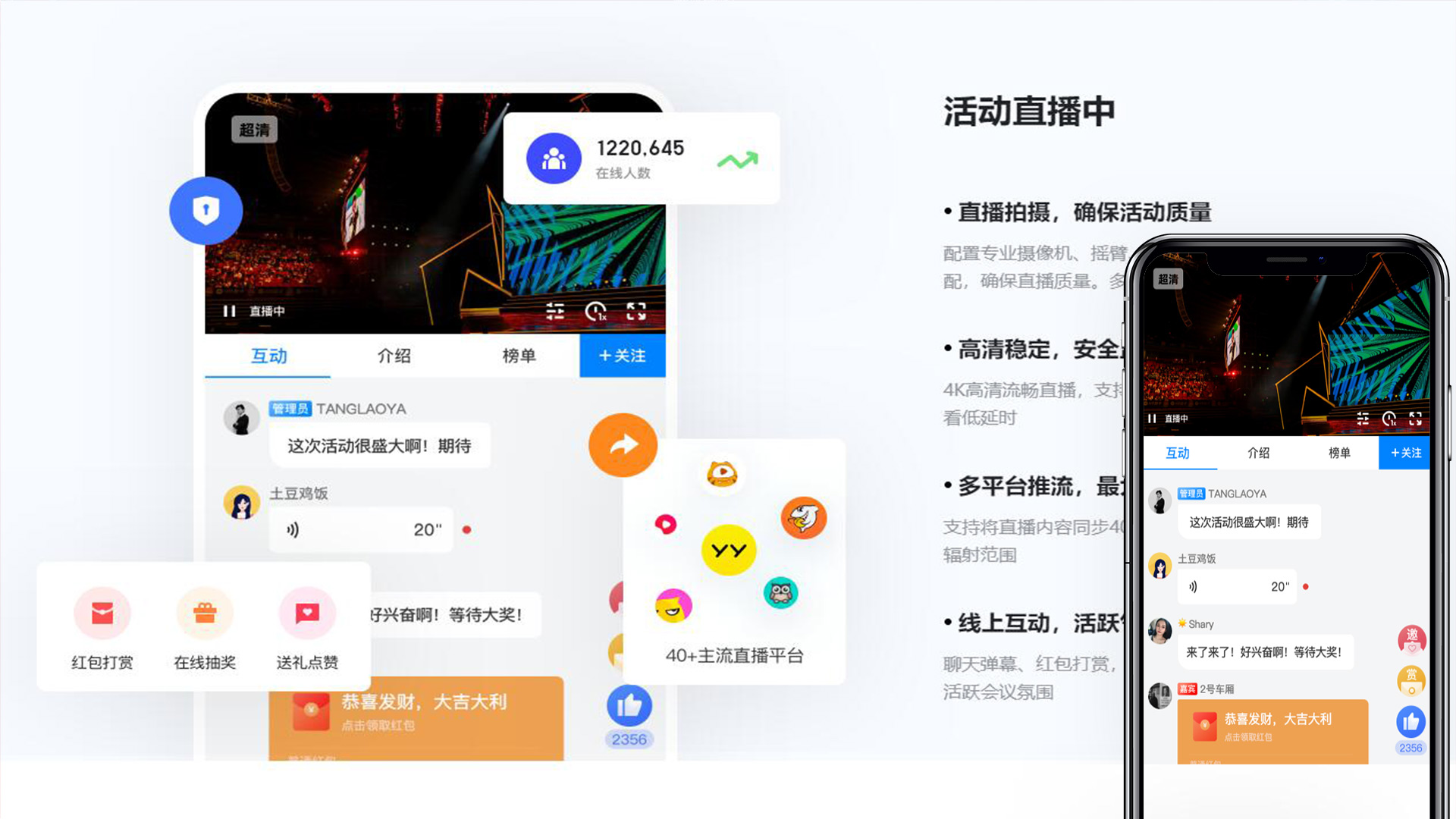 1、现有的各种大屏互动游戏全部都可以接入使用比如消息评论、发红包、摇一摇互动游戏、节目投票、滚动抽奖等,可以实现一边看直播一边参与互动游戏。